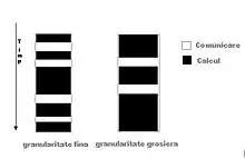 Performanța unui algoritm de calcul paralel depinde de granularitate. Aceasta se referă la mărimea task-ului în comparație cu timpul necesar comunicației și sincronizării datelor. Dacă timpul necesar comunicației și sincronizării este mai mare decât timpul de execuție al task-ului atunci granularitatea este mică. O soluție este partiționarea programului în taskuri de dimensiuni mai mari cu o granularitate grosieră. Dezavantajul acestei metode este reducerea gradului de paralelism. Îmbunătățirea performanțelor unui algoritm de calcul paralel se face prin găsirea unui compromis între mărimea task-ului și consumul suplimentar de resurse. De obicei este găsită o corelare între numărul de taskuri, dimensiunea acestora și menținerea la minimu necesar a consumului suplimentar de resurse. Cea mai bună granularitate este cea obținută prin adaptarea algoritmului pe platforma hardware pe care rulează. În majoritatea cazurilor overhead-ul asociat comunicațiilor și sincronizării este mare în comparație cu timpul de execuție caz în care se preferă o granularitate grosieră. Partiționarea unui algoritm se poate face în două moduri: