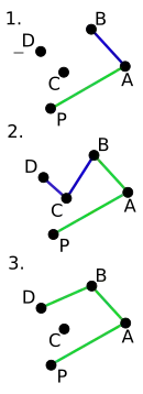 Apoi, setul de puncte trebuie sortat în ordinea crescătoare a unghiului pe care ei și punctul P îl fac cu axa x. Orice algoritm de sortare(d) de uz general în timp O(n log n) este potrivit pentru aceasta.