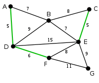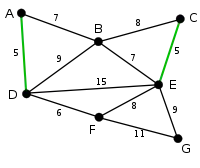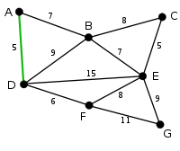 AD și CE sunt cele mai scurte muchii, de cost 5, iar AD a fost arbitrar aleasă, deci este evidențiată. |