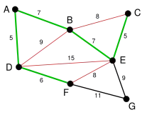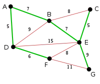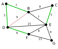 Procesul continuă cu evidențierea următoarei muchii, BE, de cost 7. Mai multe muchii sunt marcate cu roșu la acest pas: BC, deoarece ar forma ciclul BCEB, DE, deoarece ar forma ciclul DEBAD și FE deoarece ar forma ciclul FEBADF. |