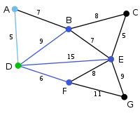 Următorul nod ales este unul din vecinii lui D sau A. B se află la distanța 9 de D și la 7 de A, E la 15 și F la 6. 6 este cel mai mic, deci se evidențiază nodul F și muchia DF. | C | B, E, G | D, A, F |