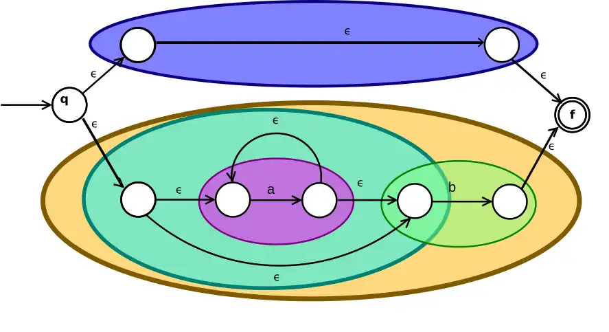 Partea din dreapta sus arată structura logică (arborele de sintaxă) de exprimare, unde "." reprezintă concatenarea (presupusă a avea aritate variabilă); subexpresiile sunt numite a-q pentru referință. Partea stângă arată automatul finit nedeterminist care rezultă din algoritmul lui Thompson, cu stările entry (inițială) și exit (finală) a fiecărei astfel de subexpresii colorate în magenta și, respectiv, cyan. ε ca etichetă a tranziției este omis pentru claritate — tranzițiile neetichetate sunt, de fapt, ε-tranziții. Stările de intrare și ieșire corespunzătoare expresiei rădăcină q sunt starea inițială și, respectiv, finală a automatului.