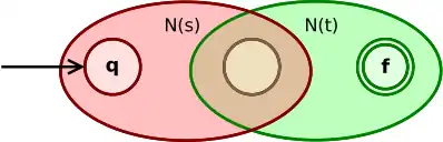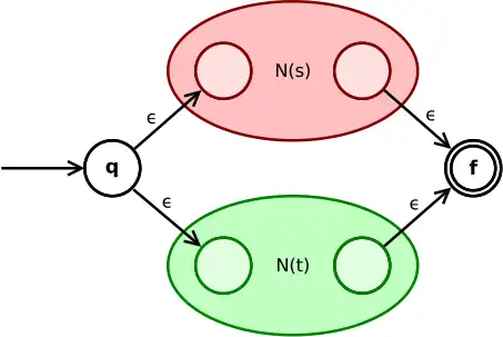 Din starea q se trece prin ε fie la starea inițială a lui N(s), fie la cea a lui N(t). Stările lor finale devin stări intermediare în întreg AFN-ul și se reunesc prin intermediul a două ε-tranziții în starea finală al AFN-ului.