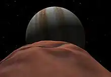 Amalthea se află pe o orbită apropiată în jurul lui Jupiter și se află în marginea exterioară a Inelului Gossamer Amalthea, care este format din praful aruncat de pe suprafața sa.[8] Jupiter ar avea un diametru aparent de 46,5 grade de pe suprafața sa.[lower-alpha 2] Amalthea este cel mai mare dintre sateliții interiori ai lui Jupiter și are o formă neregulată și o culoare roșiatică. Se crede că este alcătuit din gheață poroasă cu cantități necunoscute de alte materiale. formele sale de relief includ cratere și creste mari.[2]