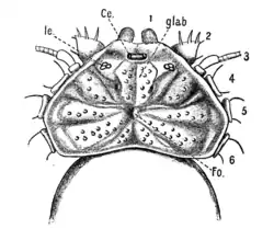 Prosoma (cefalotoracele) are formă trapezoidală și este extrem de aplatizată. Pe partea dorsală sunt situați o pereche de ochi mediani și două grupări laterale, alcătuite din trei de ochi. Prosoma poartă câte o pereche de chelicere și pedipalpi, și patru perechi de membre locomotoare. Carapacea este traversată de un șanț madian, marginile sunt proeminente. Suprafața prosomei este acoperită cu mici protuberanțe și tuberculi.