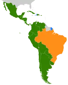 Harta lingvistică a Americii Latine: limba spaniolă cu culoarea verde, limba portugheză cu culoarea portocalie și limba franceză cu culoarea albastră.