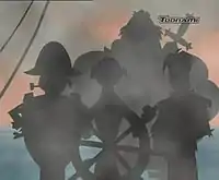 În peșteră se află munți de comori, iar pe stânca din mijloc trei sirene cântă de zor. Scoțianul le somează să înceteze și să-l elibereze pe Jack de vrajă. Sirenele îl recunosc pe Jack, care încercase să le elibereze sclavii, și căruia drept pedeapsă îi luaseră mințile și îl trimiseseră în lume să rătăcească. Scoțianul deschide focul asupra lor. Acestea se feresc și continuă cântecul, ba chiar îi determină pe marinarii vrăjiți să se ridice împotriva Scoțianului. Atunci acesta scoate cimpoiul și le face concurență sirenelor. Jack și marinarii se trezesc din vrajă. Sirenele, înfuriate, se transformă într-un monstru cu trei capete, care îl apucă pe Scoțian și sunt pe cale să-l devoreze, dar Jack, care între timp se dezmeticise și își recuperase sabia care zăcea pe-acolo într-un colț, sare și le taie capetele.