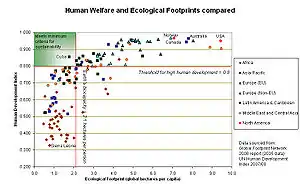 ...fiecărui locuitor îi revine în medie 2,7 hectare globale de amprentă ecologică, deși sunt doar 2,1 hectare globale de pamânt și apă bioproductivă per cap locuitor pe Pământ. Aceasta înseamnă că omenirea deja a depășit biocapacitatea globală cu 30% și la momentul de față oamenii trăiesc nesustenabil, epuizând rezervele de capital natural.