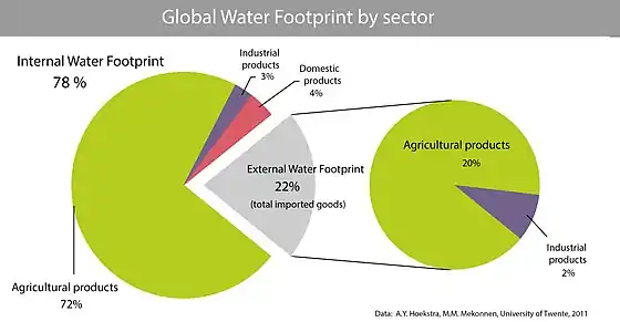 Amprenta de apă a unui produs este volumul total de apă dulce utilizat pentru fabricarea produsului, însumat pe diferitele etape ale lanțului de producție. Amprenta de apă a unui produs nu se referă doar la volumul total de apă utilizat; se are în vedere, de asemenea, unde și când este folosită apa.[20] Organizația Water Footprint Network deține o bază de date globală cu amprentele de apă ale produselor: WaterStat.[21] Puțin peste 70% din rezervele de apă la nivel mondial sunt utilizate în sectorul agricol.[22]