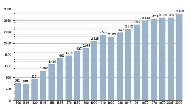 - Notă: pentru perioada 1806-1970 au fost folosite datele recensămintelor; pentru 1976, 1979 și 2005 a fost folosit numărul locuitorilor la 31 decembrie;