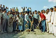 De la stânga la dreapta: Primarul din Tetulia, Președintele Sfatului Bătrânilor din Tetulia, Deputatul districtului Tetulia în Parlamentul din Bangladesh, Inginerul Șef al Unității Regionale de Gospodărire a Apelor și Andrei Filotti, Consilier șef al Organizației Națiunilor Unite (1987)