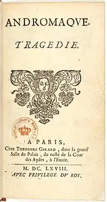 ![]() Coperta ediției princeps a tragediei Andromaque (1668) | |