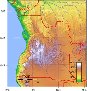 Angola Portugheză a fost un teritoriu cu o suprafață de 1.246.700 km², mai mare decât a suprafețelor Franței și Spaniei luate împreună. Colonia avea 5.198 km de frontieră terestră și o linie a litoralului de 1.600 km. Formele de relief sunt diverse. De la câmpiile litorale, cu lățime între 25 km în sud și 100-200 km în nord, formele de relief formează trepte către platoul interior înalt care acoperă cam două treimi din teritoriu, cu altitudini între 1.200 și 1.600 m. Cele mai înalte două vârfuri muntoase se află în zona de centru a platoului – Munții Moco (2.620 m) și Meco (2.538 m).