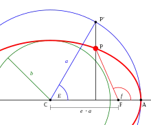 Anomalia excentrică a punctului P este unghiul E. Centrul elipsei este punctul C, iar focarul este punctul F. Vectorul de poziție r este luat din focarul F, nu din centrul de coordonate C. Cercul auxiliar are raza a, iar cercul minor auxiliar are raza b.