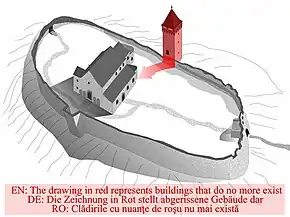 ![]() Biserica fortificată din Cisnădioara ![]() Machetă - Reconstituire pentru biserica din Cisnădioara ![]() Planul fortificaţiei din Cisnadioara[2] | |