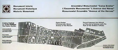 Ansamblul monumental "Calea Eroilor" realizat de Constantin Brâncuși, - între Grădina Publică și Parcul Coloanei în grădina publică și parcul Coloanei a fost înscris în Lista monumentelor istorice din județul Gorj cu cod LMI GJ-III-a-A-09465.