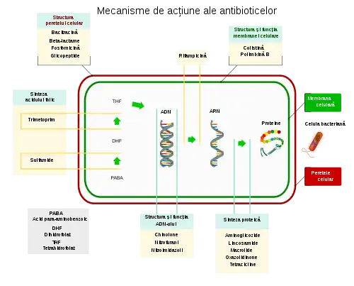 | Țintă biologică | Perete celular bacterian Membrană bacteriană Acizi nucleici Proteine bacteriene Vezi text |