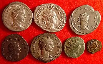 Rândul 2: Gallienus (cupru 253-268), Aurelian (270-275), imitație (cupru), imitație (cupru)