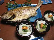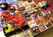 Mâncărurile tradiționale consumate de Anul Nou poartă numele de osechi-ryōri sau simplu osechi, servite în cutii denumite jubako, iar acestea sunt foarte similare ca aranjament cu cutiile bentō.[9][10] Există multe varietăți, de la alimente dulci la sărate, iar multe dintre acestea sunt doar regionale. Alte mâncăruri populare de Anul Nou sunt ozōni (o supă ce conține turtele de orez mochi și alte ingrediente, printre care legume și tofu),[11], zenzai, sashimi și sushi.[10]