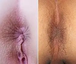 ![]() Anusul la femeie (stânga) și la bărbat (dreapta). | |