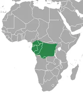 Țările cuprinse mai mult sau mai puțin în arealul său sunt Angola (nord), Camerun (sud), Republica Centrafricană (sud), Republica Congo, Republica Democratică Congo, Gabon, Guineea Ecuatorială, Rwanda și Uganda și posibil și Burundi și Nigeria.[1] Printre tipurile de habitate pe care le populează se numără pădurea tropicală umedă din Bazinul Congo(en)[traduceți], lagune costale cu apă dulce, mlaștini mangrove, râuri mici sau mari și luminișuri din păduri mlăștinoase.[3]