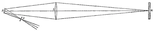 În Figura 2 se vede că Foucault a plasat oglinda rotativă R cât mai aproape de lentila L astfel încât să maximizeze distanța între R și fanta S. Când R se rotește, o imagine mărită a fantei S traversează oglinda îndepărtată M. Cu cât este mai mare distanța RM, cu atât mai repede trece imaginea peste M în timpul rotației și cu atât mai puțină lumina este reflectată înapoi. Foucault nu putea crește distanța RM în aranjamentul său optic restrâns dincolo de aproximativ 20 de metri, fără ca imaginea fantei să devină prea slabă pentru a o măsura cu precizie.[8]