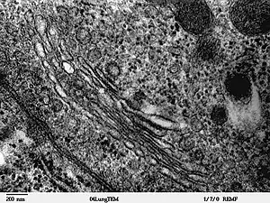 - Sintetizează polizaharidele și le "împachetează" în vezicule care vor migra spre membrana plasmatică; la celulele vegetale și fungi, Aparatul Golgi este implicat și în formarea peretelui celular. Este format din niște săculeți aplatizați suprapuși(cisterne),dilatați la capete și înconjurați de micro și macrovezicule,generate de aceste cisterne.Forma dictiozomilor variază de la o celulă la alta(în stările patologice au un aspect granulos). Sunt delimitați de o membrană simplă. În celulele animale se află un singur ansamblu de dictiozomi, iar în celula vegetală se află mai multe ansambluri de dictiozomi.