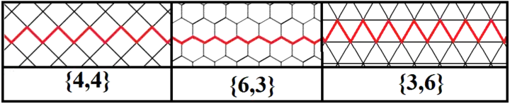 Apeirogoanele regulate în zigzag există ca poligoane Petrie ale trei pavări regulate ale planului: {4,4}, {6,3} și {3,6}. Aceste apeirogoane regulate în zigzag au unghiurile interne de 90°, 120° și respectiv 60°, corespunzătoare poligoanelor regulate ale pavării:
