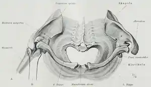 ![]() Perspectivă anterioară a toracelui (plan frontal): apertura toracică superioară este vizibilă în partea de sus. | |