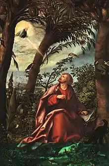 Ioan Teologul scriind Apocalipsa, pictură dintr-un altar pictat de Hans Burgkmair.