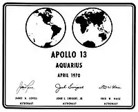 De asemenea, placa lunară originală de pe Aquarius avea numele lui Mattingly, astfel că echipajul a primit una nouă, cu numele lui Swigert, care trebuia montată peste cea originală după aselenizare. Aquarius nu a aselenizat niciodată, astfel că placa a rămas în posesia lui Lovell. În cartea sa Lost Moon (cu titlul schimbat apoi în Apollo 13), Lovell spune că în afara plăcii Apollo 13 și a câtorva alte piese, singurul obiect-amintire pe care îl mai are de atunci este o scrisoare Charles Lindbergh.