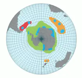 90 cm înălțime, cântărind 11 până la 16 kg, părțile superioare sunt de culoare albastru-gri oțel, se întunecă până la negru pe cap; burta este albă decolorată în portocaliu pe partea superioară a pieptului cu petice de portocaliu aprins la urechi. Ciocul negru este lung și subțire. Mandibula inferioară poate fi roz sau portocaliu. | Se reproduce pe insulele subantarctice între 45° și 55° S, în partea de nord a Antarcticii, precum și Țara de Foc, Insulele Falkland și alte insule temperate ale regiunii. |