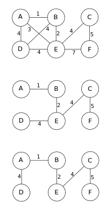 - Deoarece A și B diferă, deși conțin aceleași noduri, există cel puțin o muchie care aparține unuia, dar nu celuilalt. Dintre astfel de muchii, fie e1 cea cu cea mai mică pondere; această alegere este unică, deoarece ponderile muchiilor sunt toate distincte. Fără pierderea generalității, să presupunem că e1 este în A.
