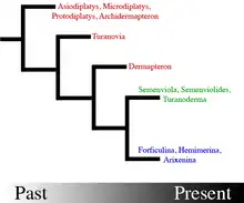 Speciile în roșu sunt specii dispărute ale ordinul Dermaptera, subordinul Archidermaptera