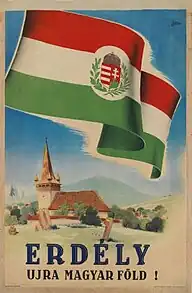 De asemenea, a fost inscripționată și pe afișe de propagandă din perioada celui de-Al Doilea Război Mondial, sub forma Erdély újra magyar föld! (în română Ardealul este iarăși pământ maghiar!), în contexte asociate cu ocuparea nordului Ardealului de către Ungaria.[16]