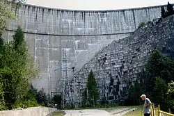 Evacuatorul de ape mari tip pâlnie de pe malul drept, se continuă cu o casetă din beton armat ce traversează corpul barajului, și apoi cu canalul rapid aval; debitul de verificare cu asigurarea de 0,1% este de 1.200 mc/sec. Două goliri de semiadâncime cu capacitatea de 200 mc/sec debușează în construcția evacuatorului de ape mari. Golirea de fund cu capacitatea de 90 mc/sec, e montată în galeria de deviere de pe malul drept. Galeria de priză a centralei hidroelectrice e amplasată pe malul stâng.