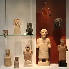 Figurină feminină așezată care poartă o curea și un colier; mileniile 3-2 î.Hr.; gresie și cuarțit; înălțime: 27,5 cm, lățime: 14,3 cm, adâncime: 14,3 cm; din Ma'rib (Yemen); Muzeul Metropolitan de Artă (New York City)