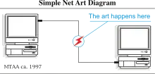 - Moss, Cecelia Laurel (). Expanded Internet Art and the Informational Milieu. Ann Arbor. p. 1. ISBN 978-1-339-32982-6.</5-Arts Net> In the 1990s, email based mailing lists provided net artists with a community for online discourse that broke boundaries between critical and generative dialogues. The email format allowed instant expression, however limited to text and simple graphic based communication, with an international scope.<5-arts net>Greene, Rachel. (). Internet art. New York, N.Y.: Thames & Hudson. pp. 73–74. ISBN 0-500-20376-8. OCLC 56809770.