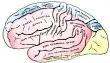 ![]() Suprafața exterioară a emisferei cerebrale, care prezintă zonele alimentate de arterele cerebrale. (Rozul este regiunea furnizată de artera cerebrală mijlocie.) | |