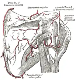 ![]() The scapular and circumflex arteries (anterior humeral circumflex visible in upper right) | |