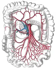 ![]() Artera mezenterică superioară și ramurile sale. (Arterele colice drepte sunt vizibile în centru) | |