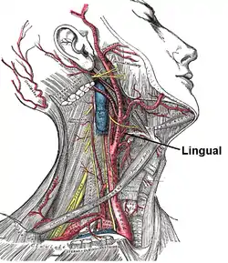 Artera linguală se desprinde din artera carotidă externă între artera tiroidiană superioară și artera facială. [1] Poate fi localizată cu ușurință în limbă.