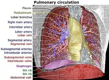 Artera pulmonară principală dreaptă și stângă trimite ramuri care corespund aproximativ lobilor pulmonari și pot fi denumite în astfel de cazuri artere lobare. Arterele lobare se ramifică în artere segmentare (aproximativ 1 pentru fiecare segment de lob), care la rândul lor se ramifică în artere pulmonare subsegmentare.[3] Acestea formează în cele din urmă artere intralobulare.[4]