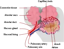 Artera pulmonară transportă sângele dezoxigenat din ventriculul drept în plămâni.[7] Sângele de aici trece prin capilare adiacente alveolelor și se oxigenează ca parte a procesului de respirație.[8]