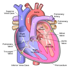 ![]() Vedere anterioară (frontală) a inimii deschise. Săgețile albe indică circulația sanguină normală. (Artera pulmonară este etichetată în dreapta sus). | |