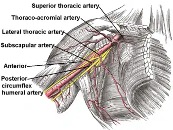 ![]() Artera axilară și ramurile sale, inclusiv artera subscapulară - vedere anterioară a membrului superior drept și a toracelui | |