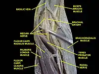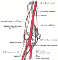 - artera colaterală radială (collateralis radialis) este ramura terminală a arterei brahiale profunde; perforează împreuna cu nervul radial septul intermuscular lateral al brațului, și în șanțul bicipital lateral se anastomozează cu artera recurentă radială din artera radială.