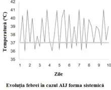 | AIJ sistemică: are o pondere de 10-20% dintre toate cazurile de artrită idiopatică juvenilă[32]. Sindromul febril constituie elementul clinic principal de diferențiere față de alte forme clinice. |