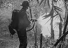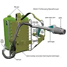 Posterior și în timpul războiului din Vietnam, americanii au folosit din plin aruncătoarele de flăcări ca metodă eficientă de luptă împotriva tunelelor Vietcong și distrugerea micilor așezări care sprijineau rezistența. Există lansatoare de foc portabile și montate pe vehicule. Cele portabile conțin 10-15 litri și raza de acțiune variază între 25 și 70 m, putând arunca 15-20 ori. Cele instalate pe vehicule în mod normal blindate. Fiecare poate avea 20-30 litri și raza de acțiune variază între 35 și 150 m , unele modele pe care le are armata americană ating 165 m. În timpul celui de al doilea război mondial s-au folosit vehicule care aveau un rezervor de 645 litri pentru aruncătoarele de flăcări. Posterior s-au construit altele specializate doar în aruncătoare de foc cu rezervoare de 1300 litri.