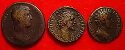 Sesterțul și denarul iau locul, în mod progresiv, asului care dispare din compunerea tezaurelor din perioada Antoninilor[19].